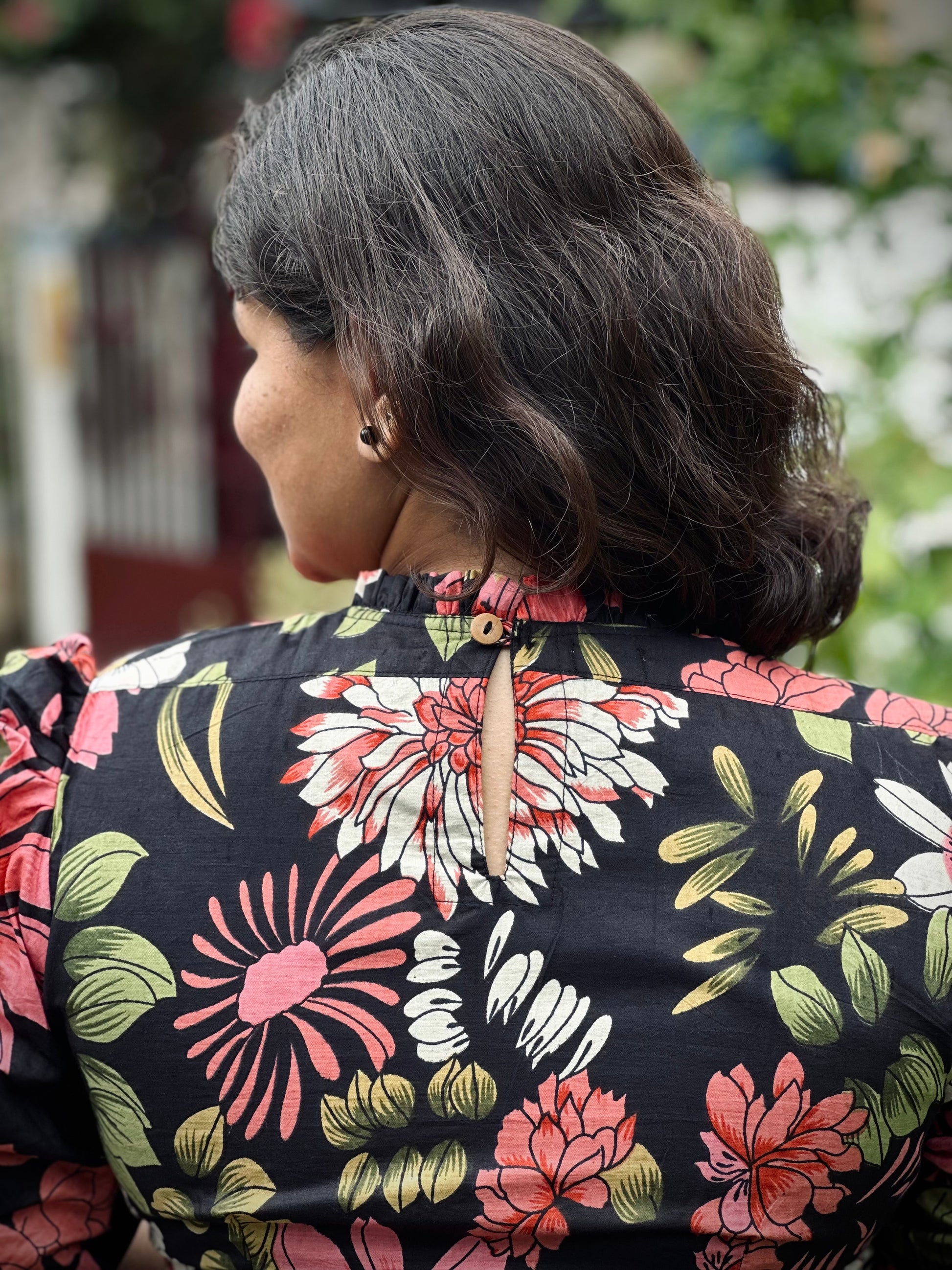 Style: Straight Kurthi / Close ruffle neck / Elbow puff sleeve