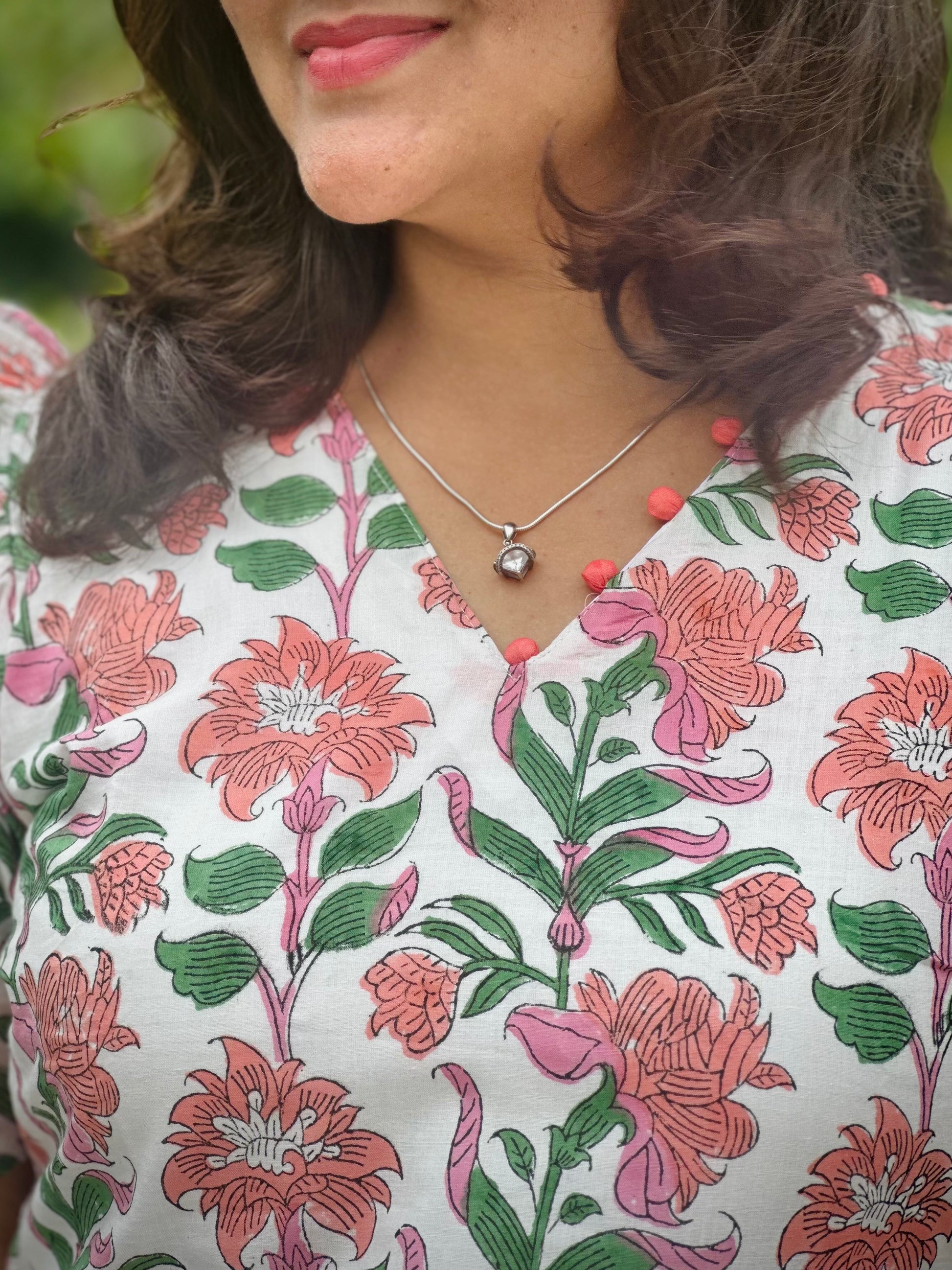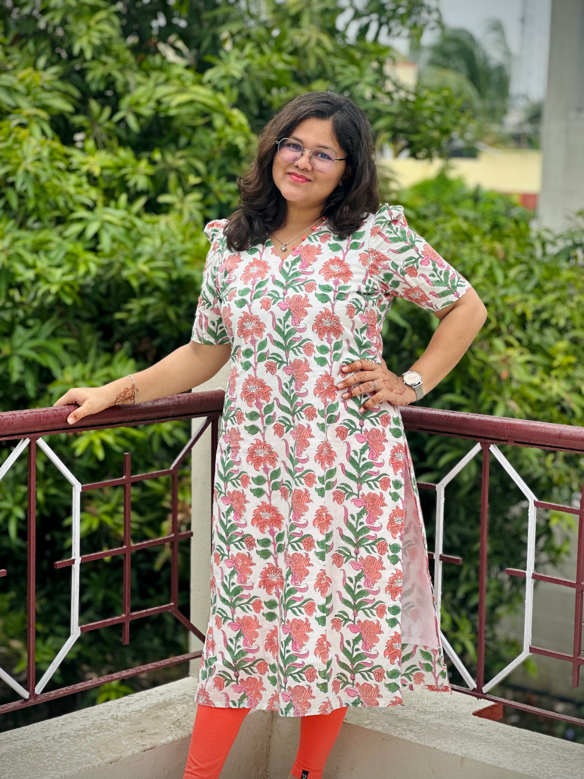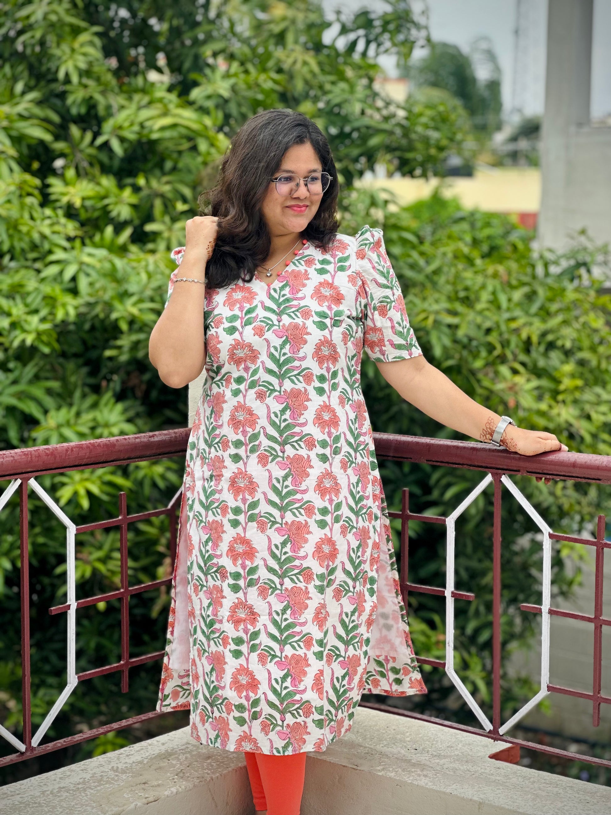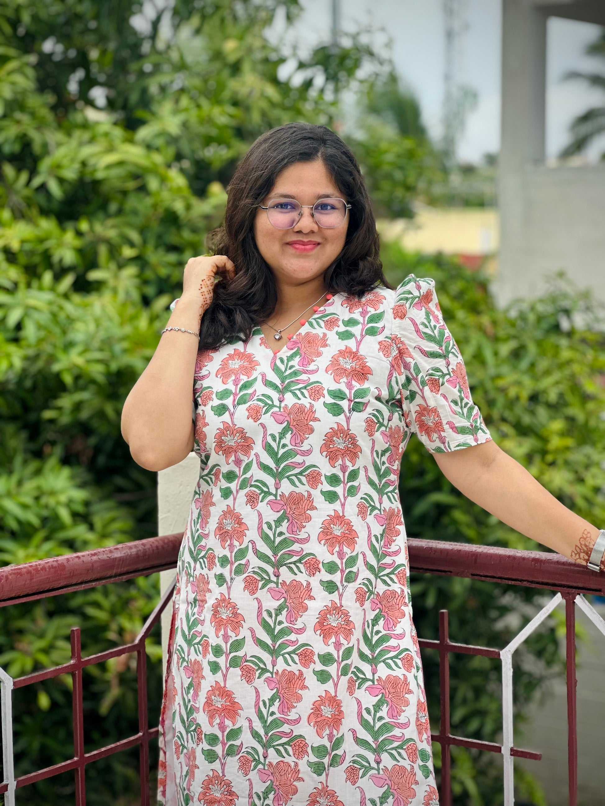 Style: Straight Kurthi / V neck/ Elbow puff sleeve