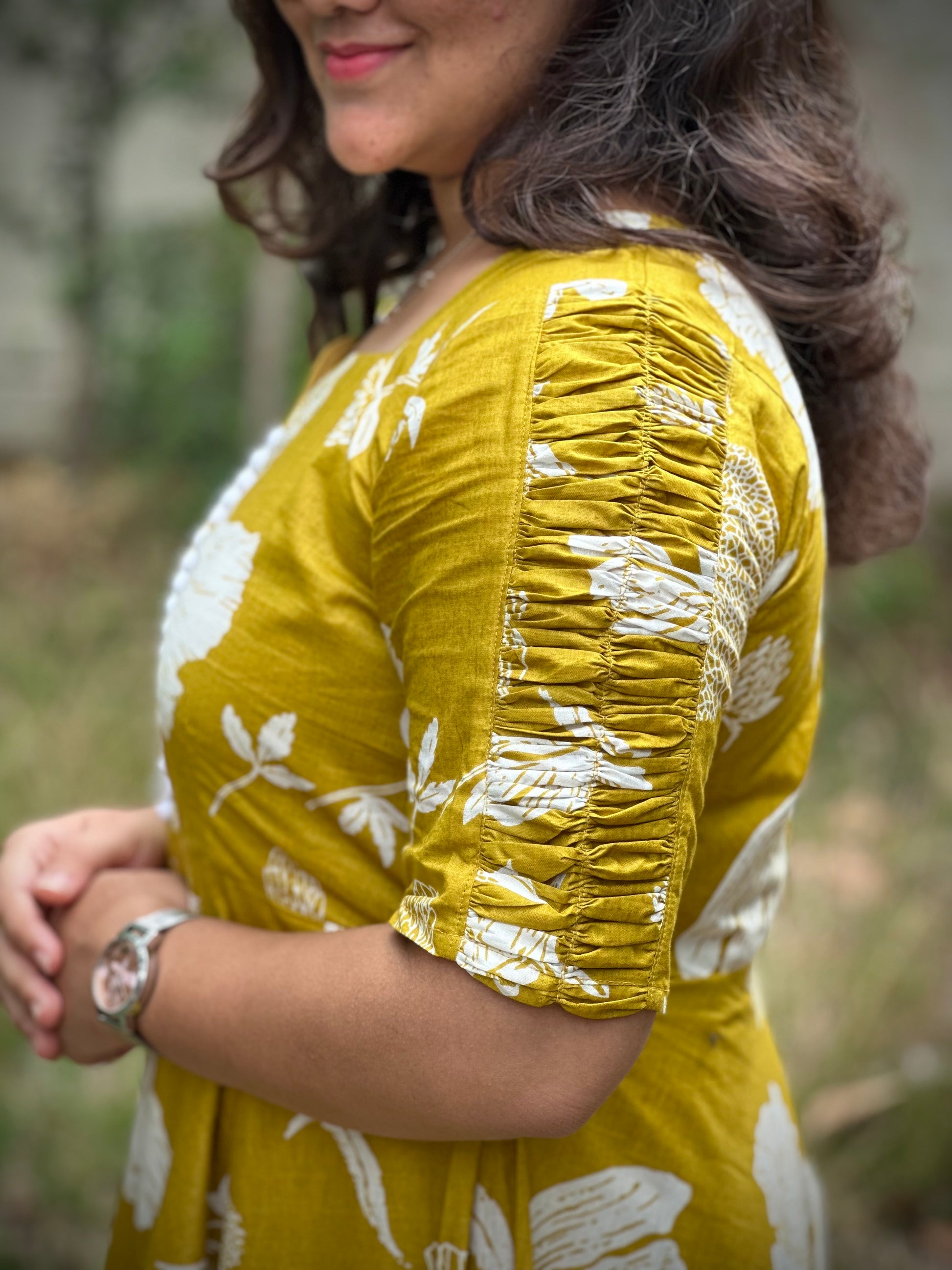 NECK N SLEEVE: Sweetheart neck with potli detailing and Elbow ruffle sleeves